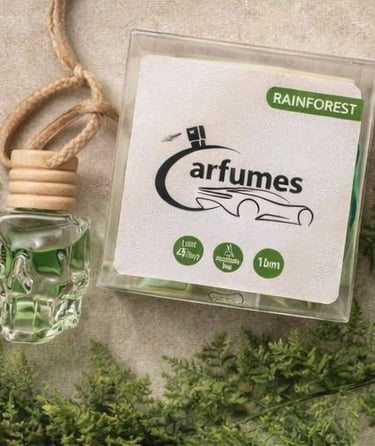 CARFUMES RAINFOREST, a fresh green and earthy fragrance inspired by nature after rain, designed to rejuvenate your senses and create a calm, refreshing escape.
